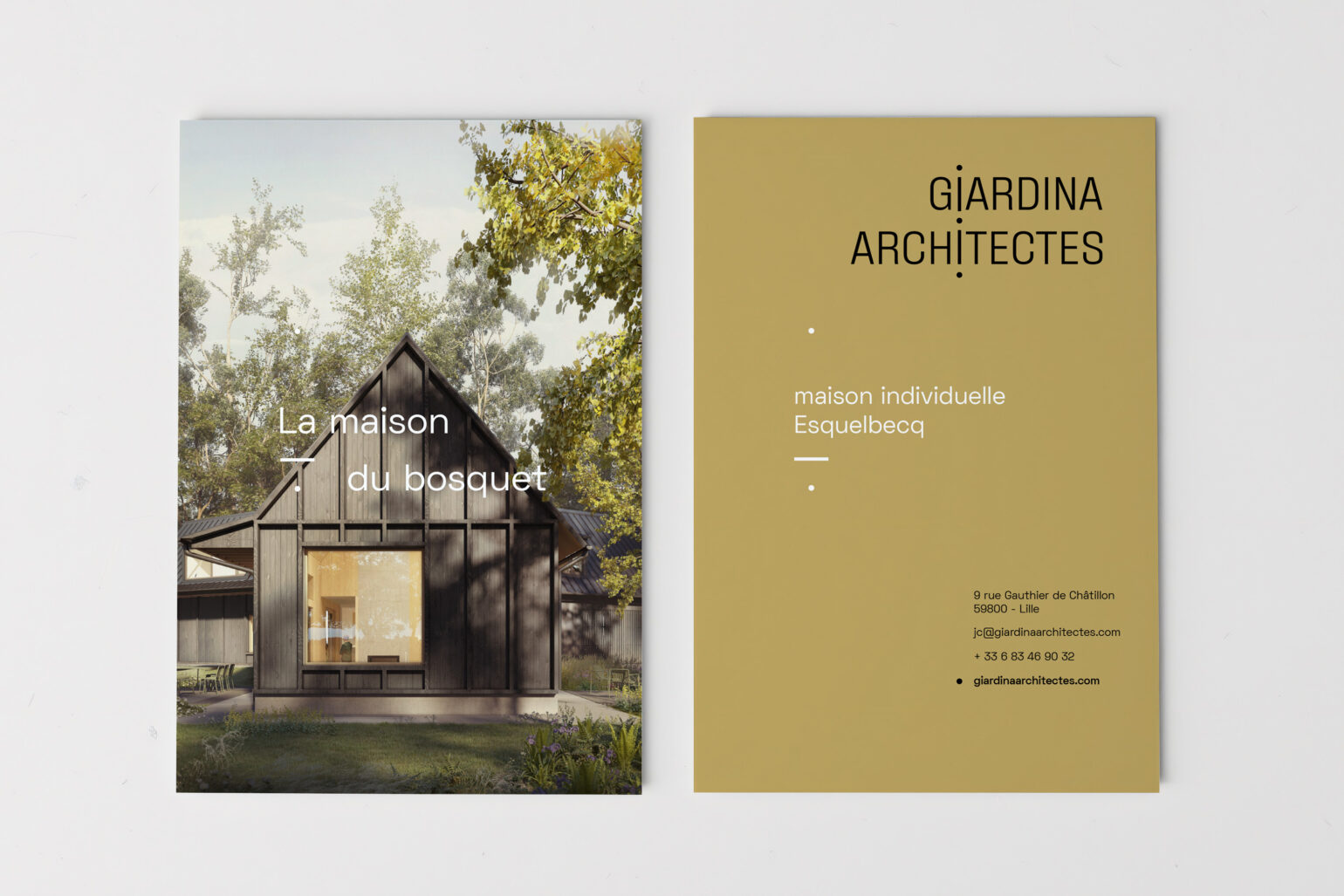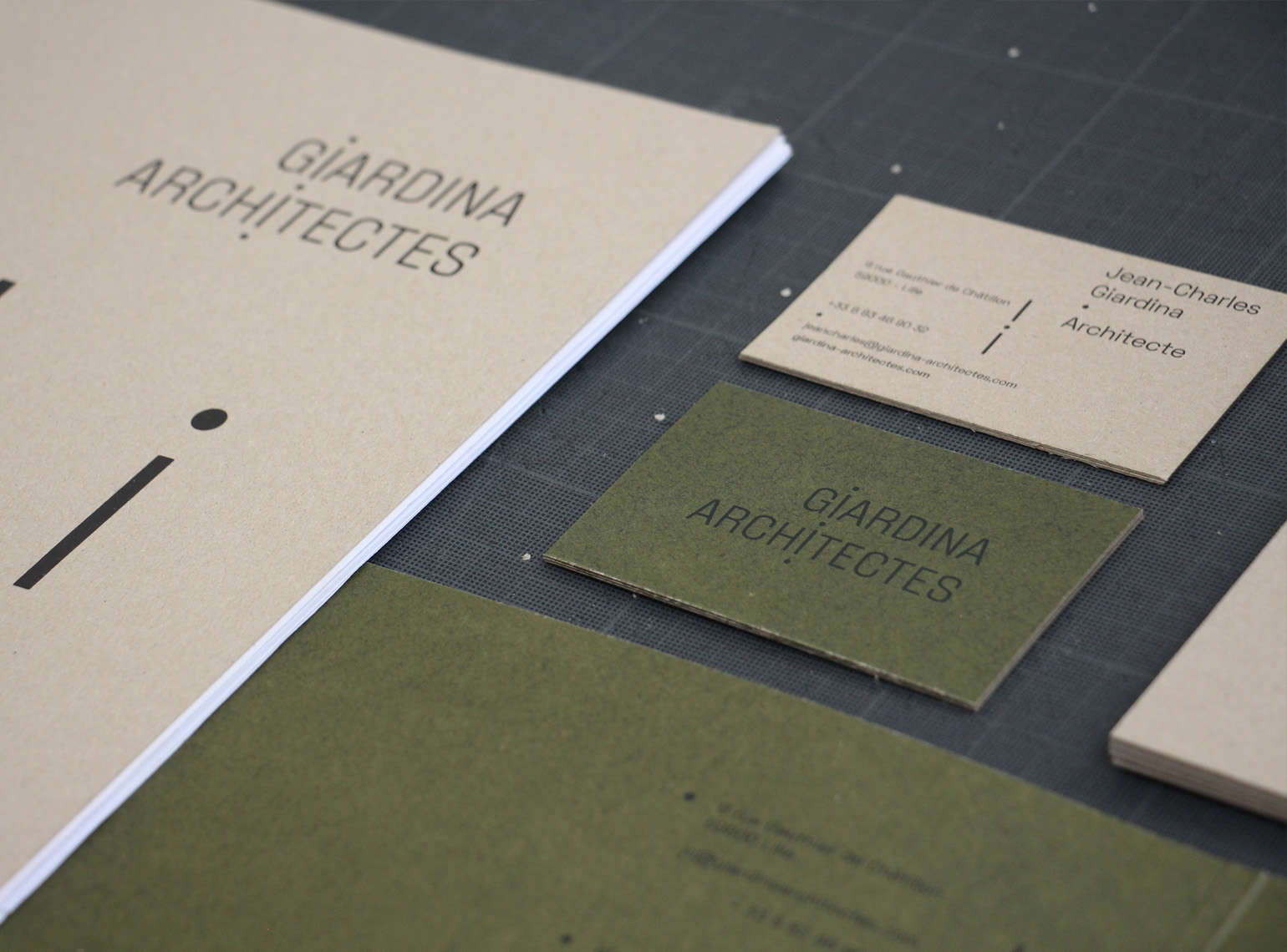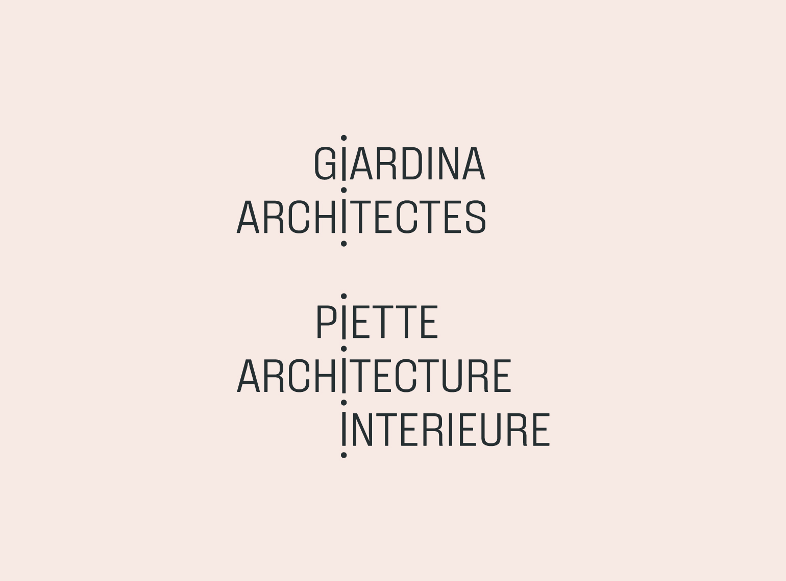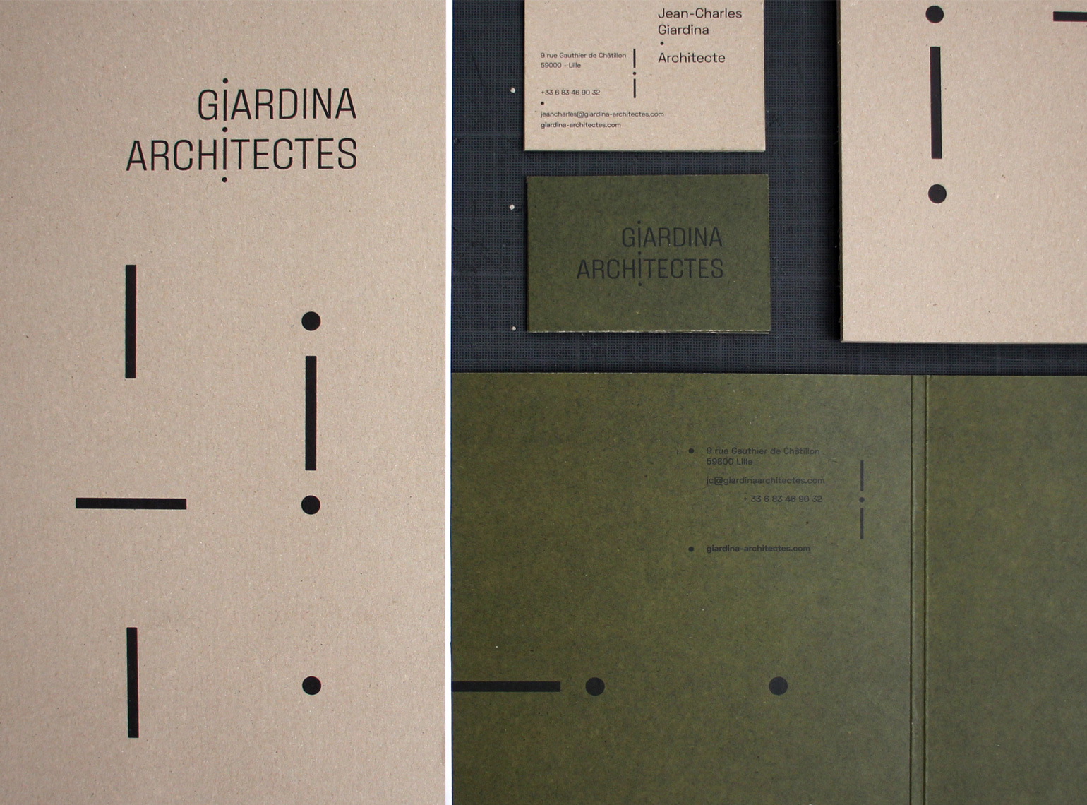 Giardina Architectes est une agence d’architecture à double casquette. Elle répond à la fois à la restructuration, construction de bâtiment et à l’aménagement d’espace intérieur. Pour ce couple d’architecte nous avons dessiné un système d’identité commun reposant sur un jeu d’assemblage typographique. Le trait et le point deviennent des éléments de liaisons, d’équilibre.