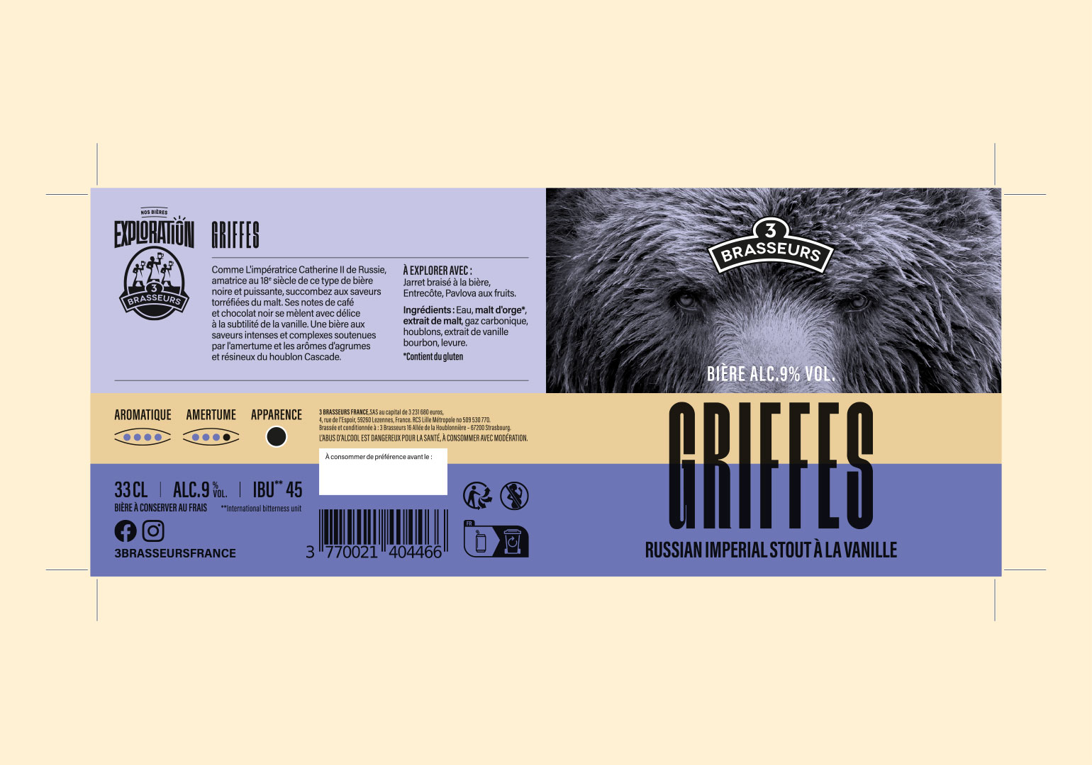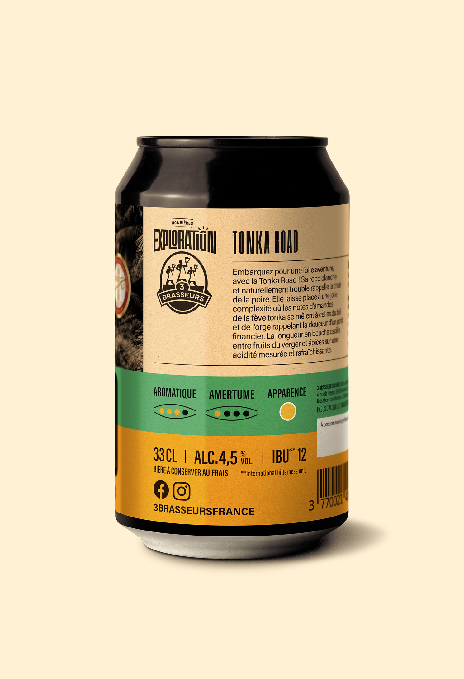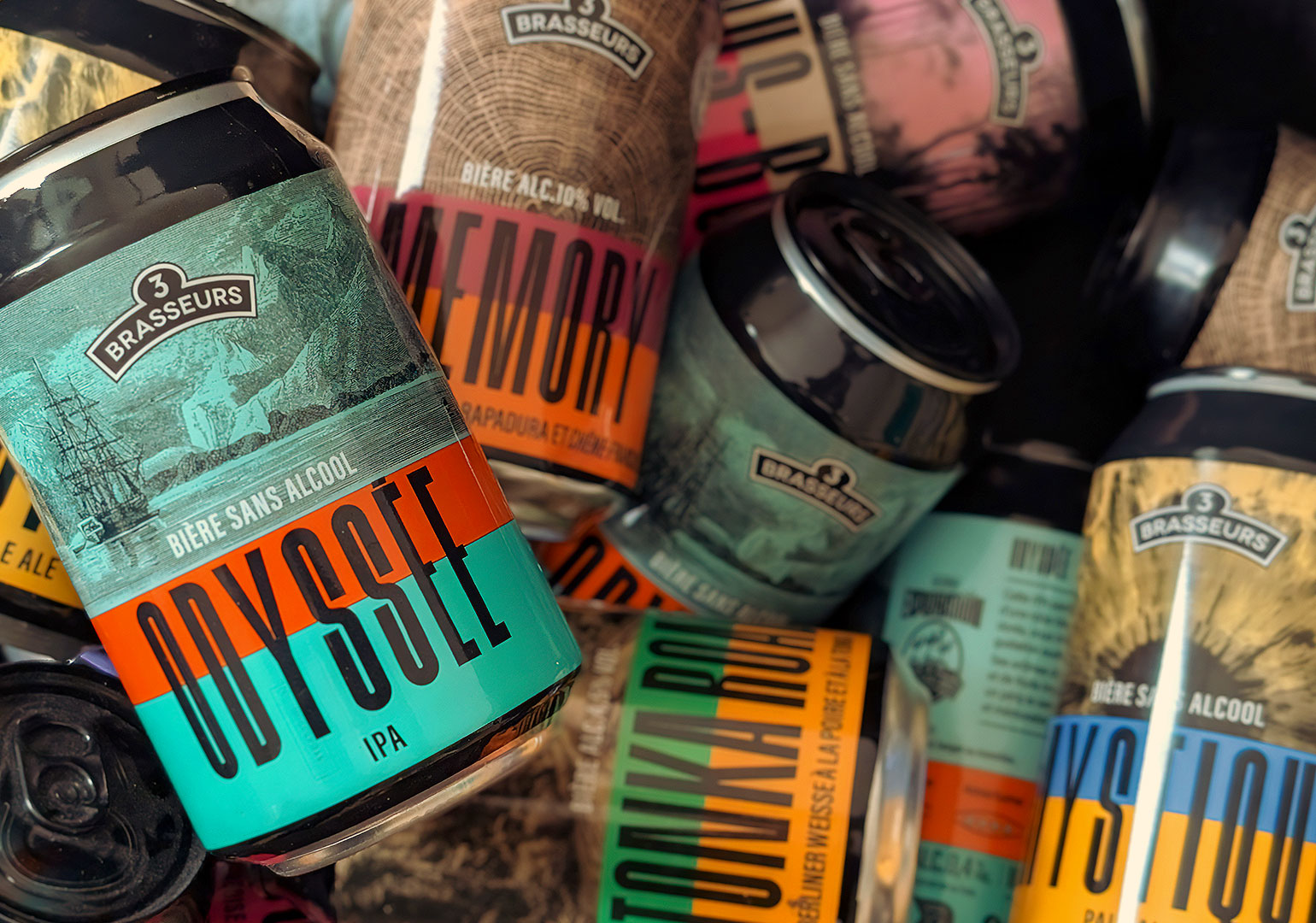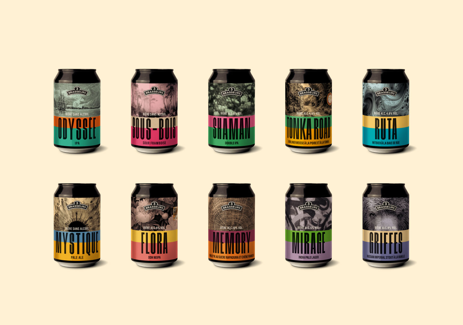 Pour la gamme Exploration des 3 Brasseurs, le studio a accompagné la marque dans la conception d’un univers global, pensé comme une expérience de découverte à la fois gustative, narrative et visuelle. Au-delà du design des packagings, le studio est intervenu sur la construction du discours de la gamme et la création des noms de chacune des bières. Inscrits dans un même champ lexical, ces noms évoquent le voyage, l’exotisme, l’éveil des sens et la gourmandise, et participent à raconter une promesse d’aventure et de curiosité. Le travail graphique prolonge cette réflexion à travers des combinaisons de couleurs vives et tranchées, affirmant le caractère audacieux et expérimental de la gamme. Les visuels, sensoriels et évocateurs, dialoguent avec le nom et l’identité de chaque bière pour composer un territoire visuel fort, cohérent et identifiable.