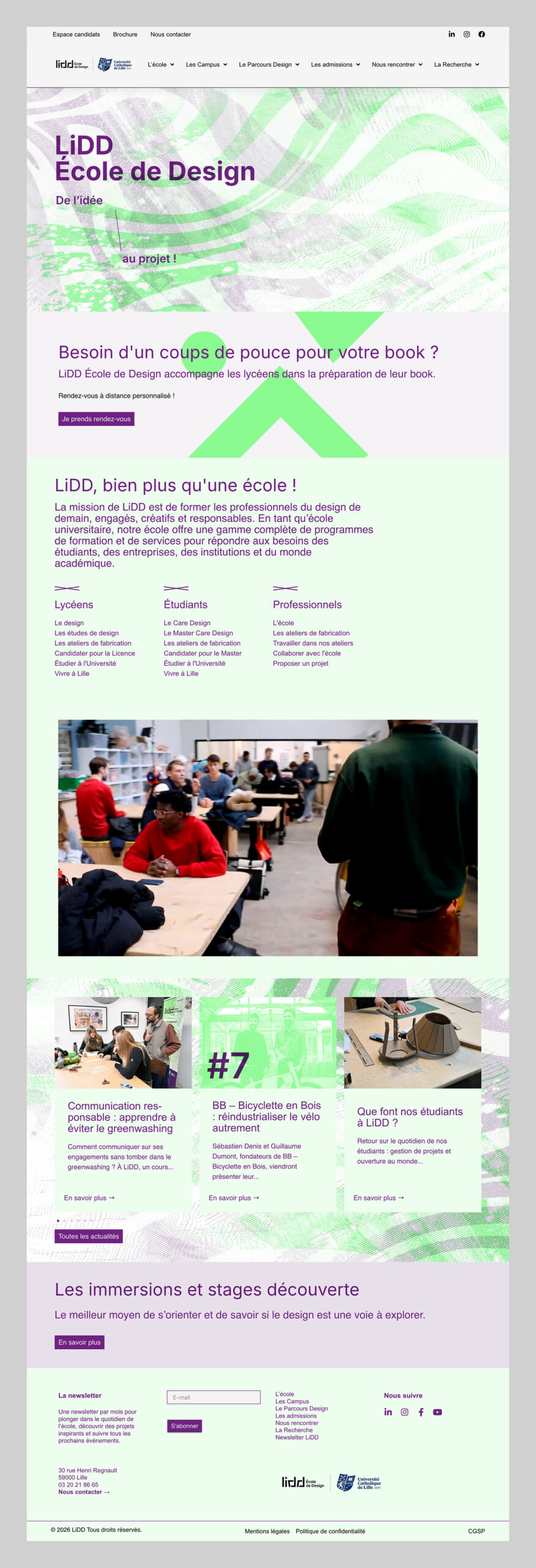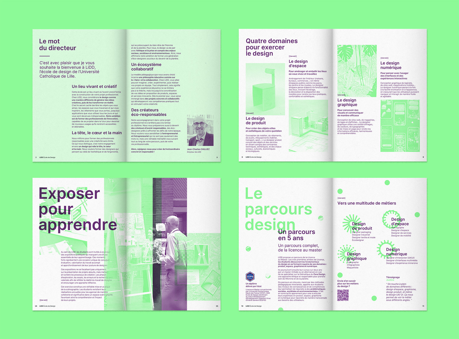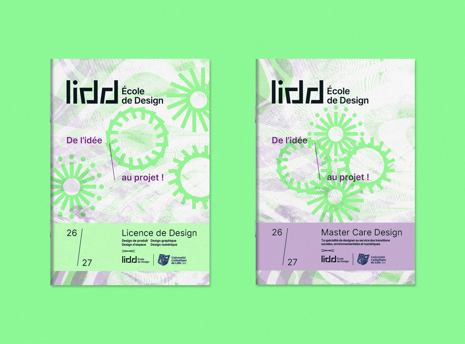 Nous avons conçu l’identité visuelle et la charte « édition » (print/web) de LiDD, école de design de l’Université Catholique de Lille, à partir d’un logotype préexistant. Le système graphique s’appuie sur sa structure géométrique modulaire, utilisée comme outil de composition pour organiser l’espace, hiérarchiser les contenus et instaurer un rythme. Une matière visuelle expressive — textures, distorsions, mouvements — vient enrichir ce socle et traduit la dynamique pédagogique de l’école, orientée vers l’expérimentation.