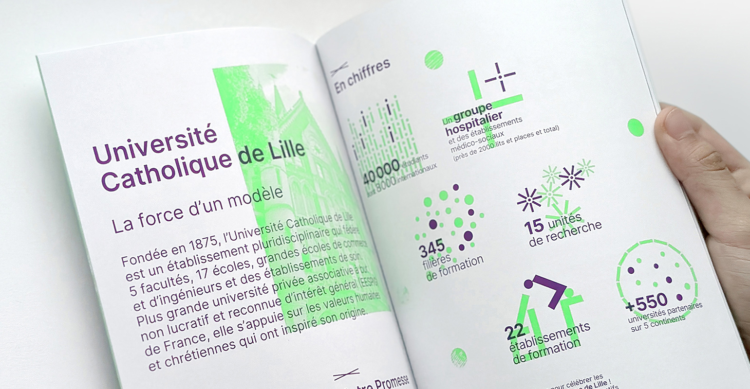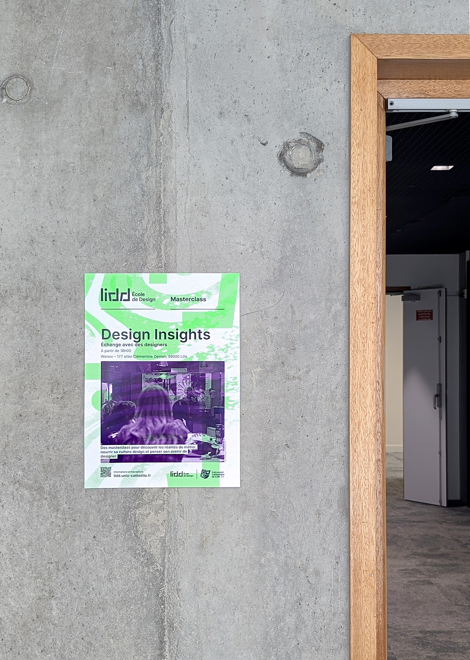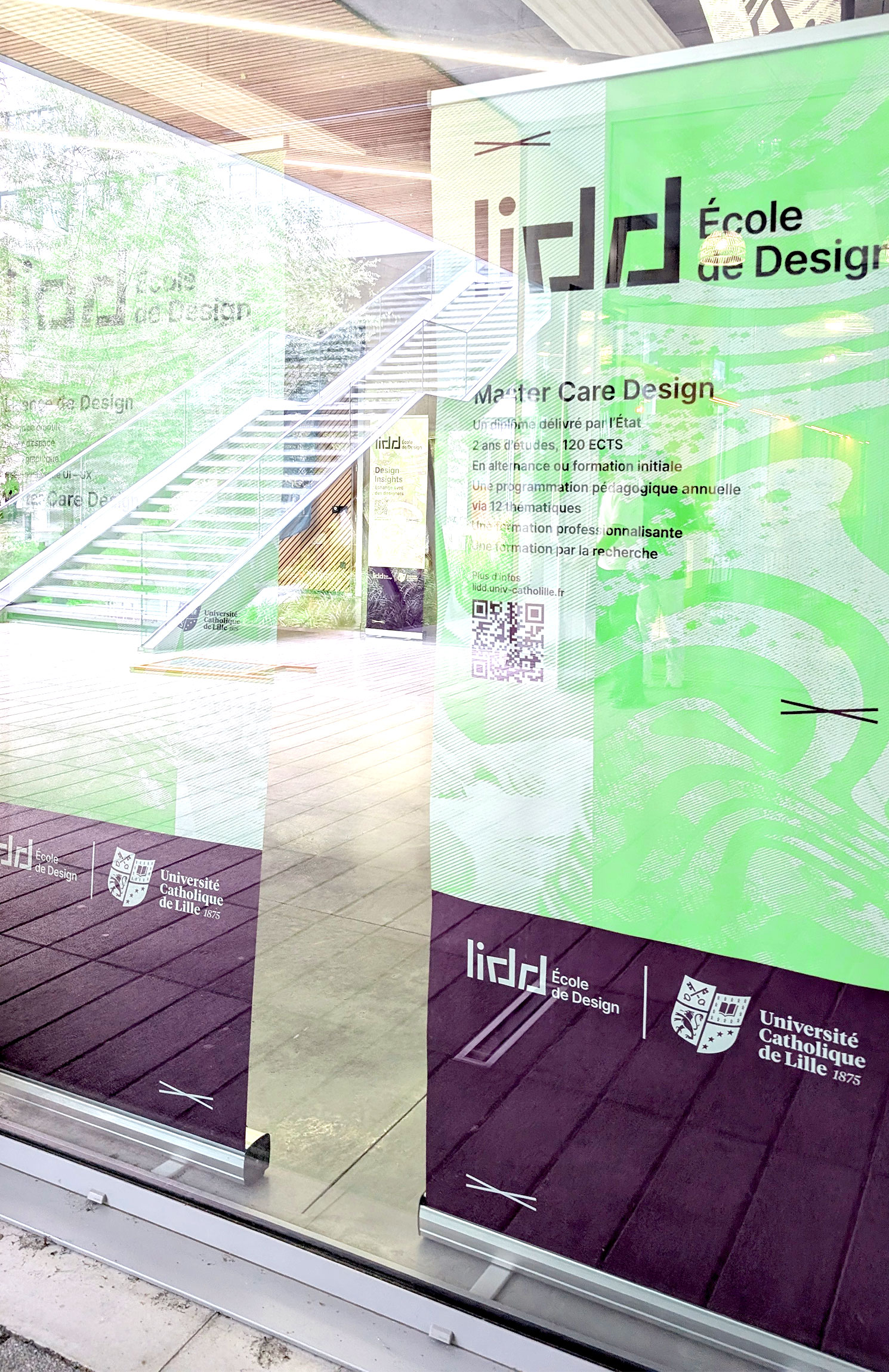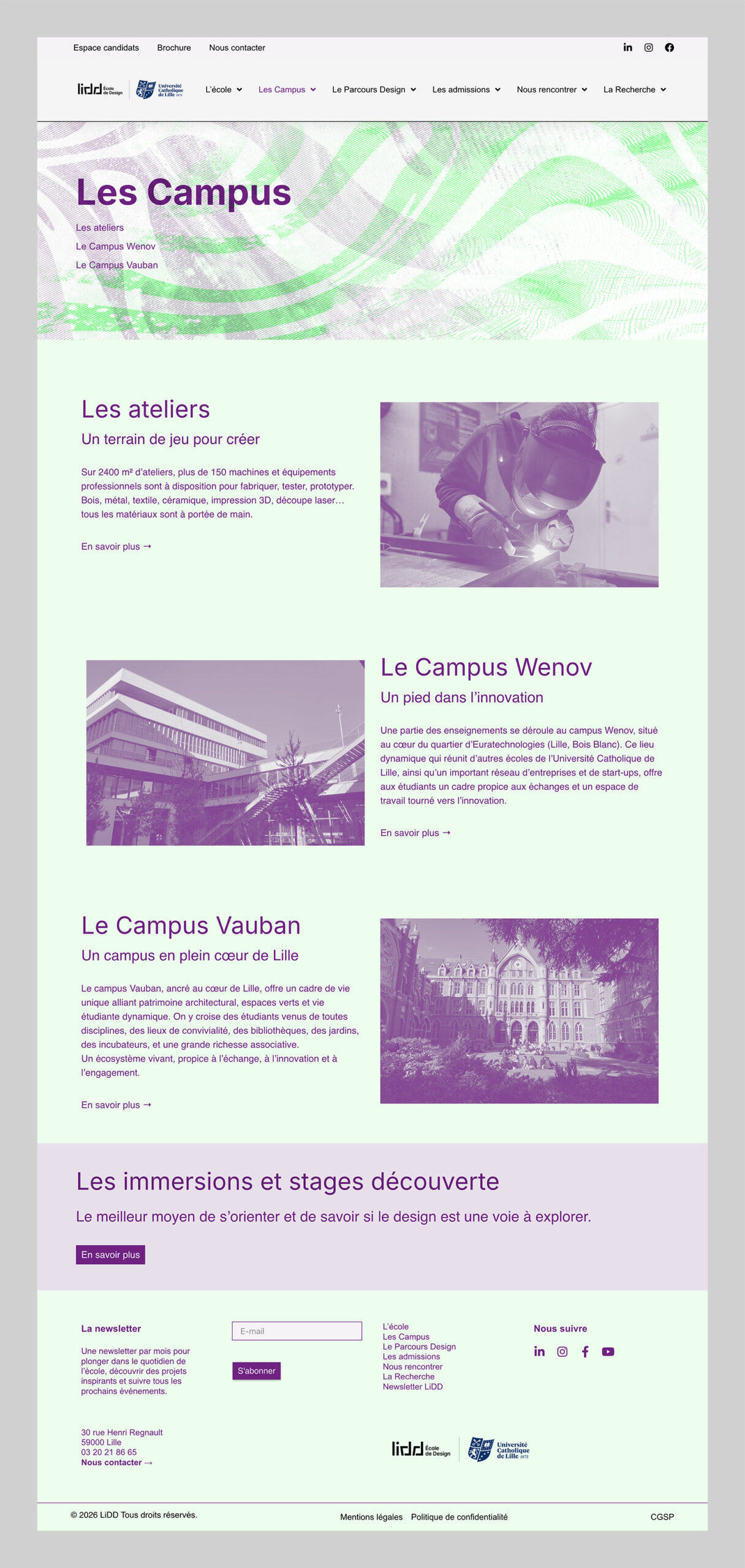 Nous avons conçu l’identité visuelle et la charte « édition » (print/web) de LiDD, école de design de l’Université Catholique de Lille, à partir d’un logotype préexistant. Le système graphique s’appuie sur sa structure géométrique modulaire, utilisée comme outil de composition pour organiser l’espace, hiérarchiser les contenus et instaurer un rythme. Une matière visuelle expressive — textures, distorsions, mouvements — vient enrichir ce socle et traduit la dynamique pédagogique de l’école, orientée vers l’expérimentation.
