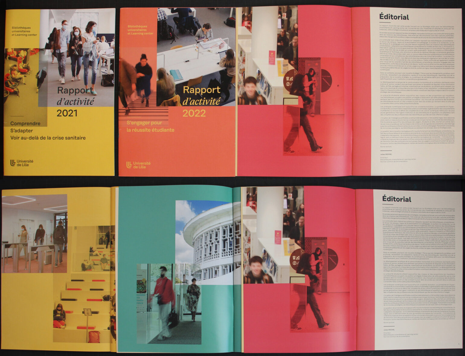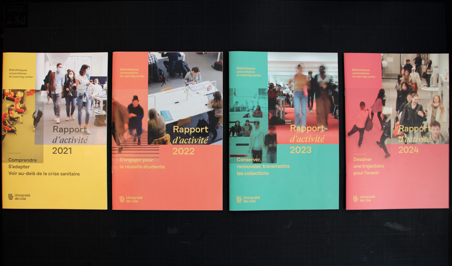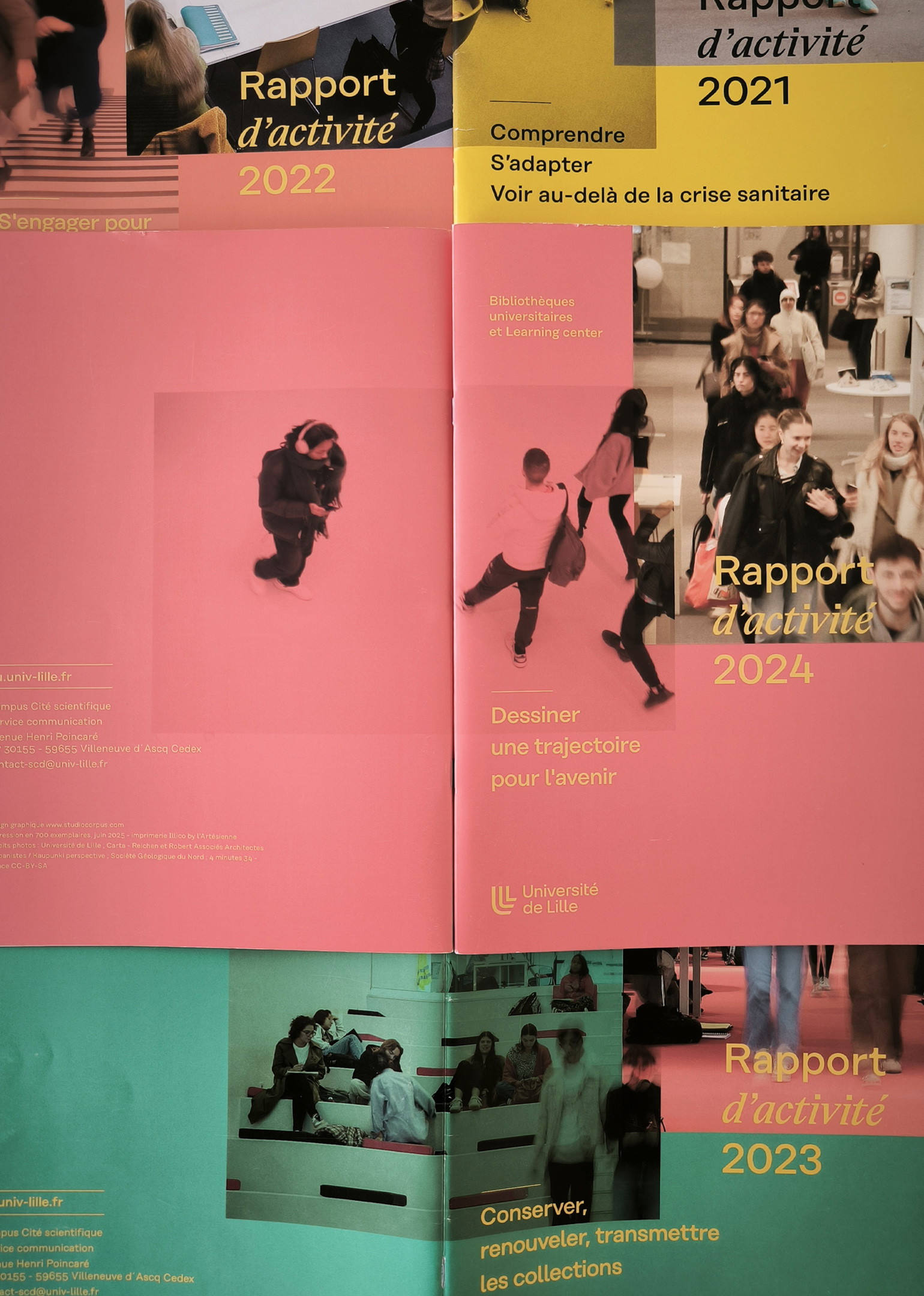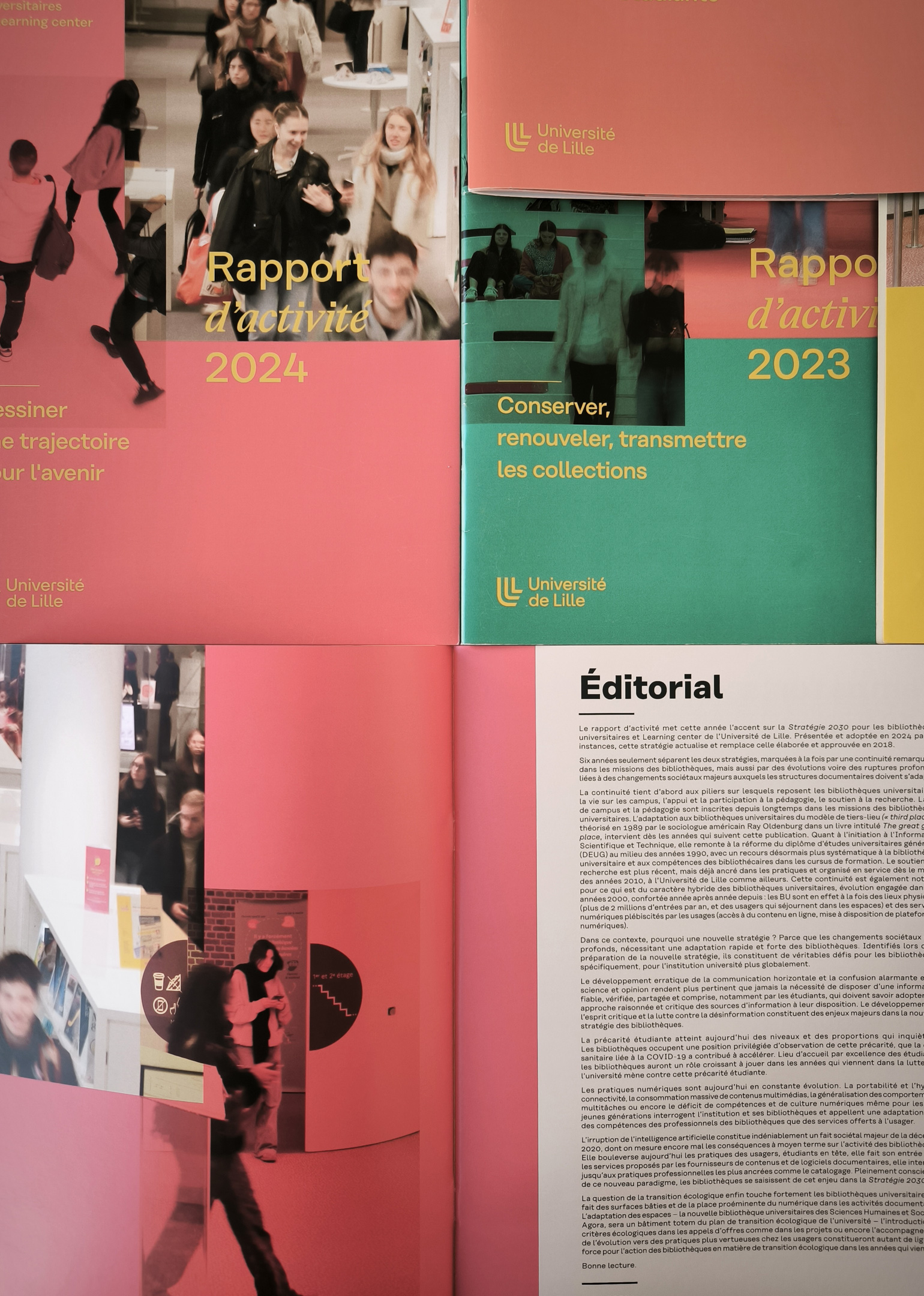 En 2021, suite à la nouvelle identité et charte graphique de l’université de Lille, nous avons mis en place un système d’édition illustrant un espace de transmission en constante évolution, les bibliothèques universitaires et Learning center.